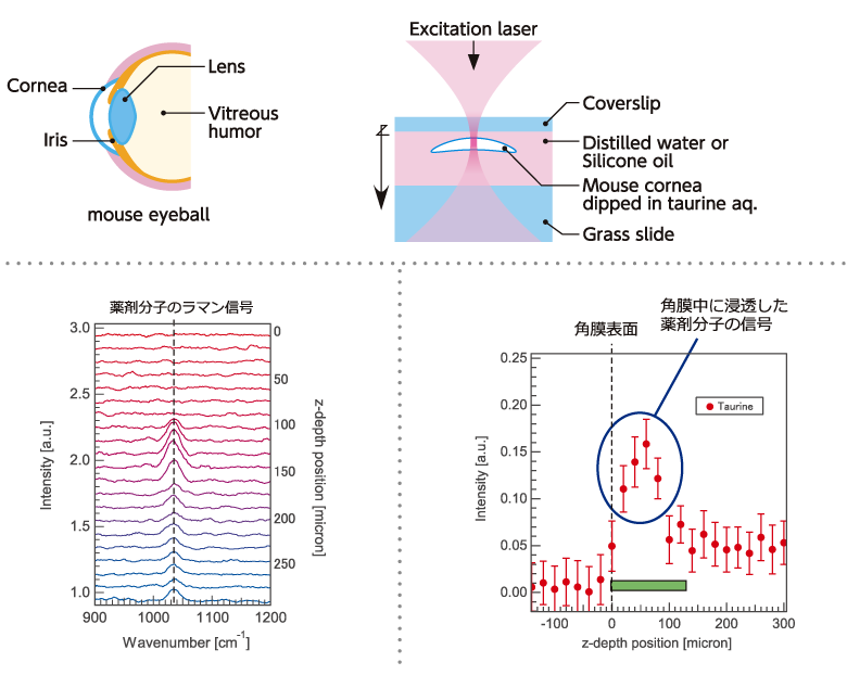 生体内での薬剤分布を観測した応用例 マウスの角膜に薬品を浸透させ、角膜内部に浸透した薬剤のラマン信号を指標にして、深さ方向の濃度分布を、測定することに成功しました。 測定には生体組織を透過し易い近赤外線を用いている為、生体内部の様子を観察することが出来ます。(分散補償光学系)