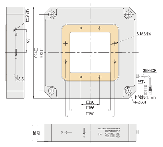 P15.XYZ ピエゾ位置決めステージ 300 μm     貫通穴 60×60 mm