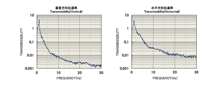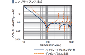 チューンド・マス・ダンピング構造を内蔵した『ハイグレードダンピング・スチールハニカム定盤』と『高性能三次元空気ばねシステム』を組むことにより、最高レベルの除振性能を提供します。 定盤はそれぞれ固有の周波数に曲げ・ねじれの振動モードを持っており、寸法・形状によって全て異なります。この振動モードに合わせ、一つ一つ設計されたチューンド・マス・ダンピング構造を内蔵することにより、下記のコンプライアンス曲線のような共振ピークを抑えた高性能の定盤を実現しています。 上面のダンピングにより、作業面の共鳴を低下。落下防止ボトム構造のシールド加工も標準装備しています。 床からの振動に対しては、全方位対応三次元空気ばねを配置し、固有振動数は垂直方向1.2~1.8Hz、水平方向0.6~0.8Hzに抑え、下に示す伝達率を実現します。